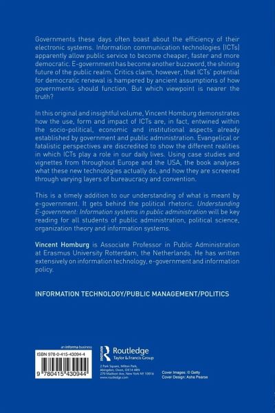 Governments these days often boast about the efficiency of their electronic systems. Information communication technologies (ICTs) apparently allow public service to become cheaper, faster and more democratic. E-government has become another buzzword, the shining future of the public realm. Critics claim, however, that ICTs' potential for democratic renewal is hampered by ancient assumptions of how governments should function. But which viewpoint is nearer the truth? In this original and insightful volume, Vincent Homburg demonstrates how the use, form and impact of ICTs are, in fact, entwined within the socio-political, economic and institutional aspects already established by government and public administration. Evangelical or fatalistic perspectives are discredited to show the different realities in which ICTs play a role in our daily lives. Using case studies and vignettes from throughout Europe and the US, the book analyzes what these new technologies actually do, and how they are screened through varying layers of bureaucracy and convention. This is a timely addition to our understanding of what is meant by e-government. It gets behind the political rhetoric. Understanding E-Government: Information Systems in Public Administration will be key reading for all students of public administration, political science, organization theory and information systems.