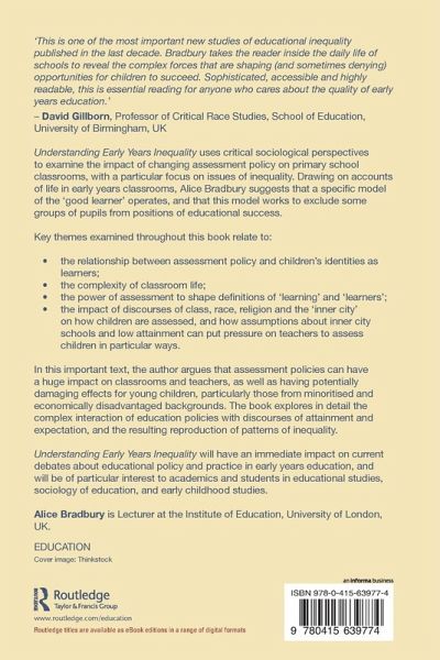 Understanding Early Years Inequality uses critical sociological perspectives to examine the impact of changing assessment policy on primary school classrooms, with a particular focus on issues of inequality. Drawing on accounts of life in early years classrooms, Alice Bradbury suggests that a specific model of the 'good learner' operates, and that this model works to exclude some groups of students from positions of educational success. Key themes examined throughout this book relate to: The relationship between assessment policy and children's identities as learners; The complexity of classroom life; The power of assessment to shape definitions of 'learning' and 'learners'; The impact of discourses of class, race, religion and the 'inner city' on how children are assessed, and how assumptions about inner city schools and low attainment can put pressure on teachers to assess children in particular ways. In this important text, the author argues that assessment policies can have a huge impact on classrooms and teachers, as well as having potentially damaging effects for young children, particularly those from minoritised and economically disadvantaged backgrounds. The book explores in detail the complex interaction of education policies with discourses of attainment and expectation, and the resulting reproduction of patterns of inequality. Understanding Early Years Inequality will have an immediate impact on current debates about educational policy and practice in Early Years education, and will be of particular interest to academics and students in educational studies, sociology of education, and early childhood studies.