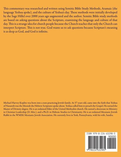 This commentary was researched and written using Semitic Bible Study Methods, Aramaic (the language Yeshua spoke), and the culture of Yeshua's day. These methods were initially developed by the Sage Hillel over 2000 years ago augmented and the author. Semitic Bible study methods are based on asking questions about the Scripture, examining the language and culture of that day. This is a strange idea for church people because the Church teaches that only the Church can interpret Scripture. This is not true. God wants us to ask questions because Scripture's meaning is as deep as God, and God is infinite.