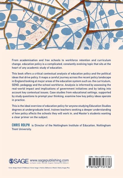 This book offers a critical contextual analysis of education policy and the political ideas that drive policy. It maps a careful journey across the recent policy landscape in England looking at major areas of the education system such as: the curriculum, SEND, pedagogy and the school workforce. Analysis is informed by assessing the real-world impact and implications of government initiatives and by taking into account key contextual issues. Case studies from educational settings, supported by study questions to prompt your thinking, examine how key policy ideas operate in practice.