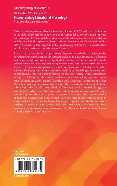 In much of current educational psychology, there are unresolved contradictions that have their origin in the opposition between body and mind, individual and collective, and structure and process-including the different nature of intellect and affect or the difference between knowledge and its application. Many of the same contradictions are repeated in constructivist approaches, which do not overcome dichotomies but rather acerbate them by individualizing and intellectualizing our knowledgeable participation in recognizably exhibiting and producing the everyday cultural world. Interestingly enough, L. S. Vygotsky, who is often used as a referent for making arguments about inter- and intrasubjective "mental" "constructions," developed, towards the end of his life, a Spinozist approach according to which there is only one substance. This one substance manifests itself in two radically different ways: body (material, biology) and mind (society, culture). But there are not two substances that are combined into a unit; there is only one substance. Once such an approach is adopted, the classical question of cognitive scientists about how symbols are grounded in the world comes to be recognized as an artefact of the theory. Drawing on empirical materials from different learning settings-including parent-child, school, and workplace settings-this book explores the opportunities and implications that this non-dualist approach has for educational research and practice.