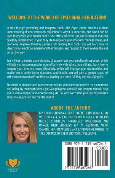 Welcome to the world of emotional regulation! In this thought-provoking and insightful book, Kim Pryor Jones provides a clear understanding of what emotional regulation is, why it is important, and how it can be used to improve your mental health. She offers practical tips and strategies that can be easily implemented in your daily life to regulate your emotions, manage stress, and overcome negative thinking patterns. By reading this book, you will learn how to identify your emotions, understand their triggers, and respond to them in a healthy and productive way. You will gain a deeper understanding of yourself and your emotional responses, which will help you to communicate more effectively with others. You will also learn how to manage your emotions more effectively, which will improve your relationships and enable you to make better decisions. Additionally, you will gain a greater sense of self-awareness and self-confidence, leading to a more fulfilling and satisfying life. This book is an invaluable resource for anyone who wants to improve their emotional well-being. By reading this book, you will gain practical skills and insights that will help you to lead a happier and more fulfilling life. So, why wait? Start your journey towards emotional regulation and mental health!