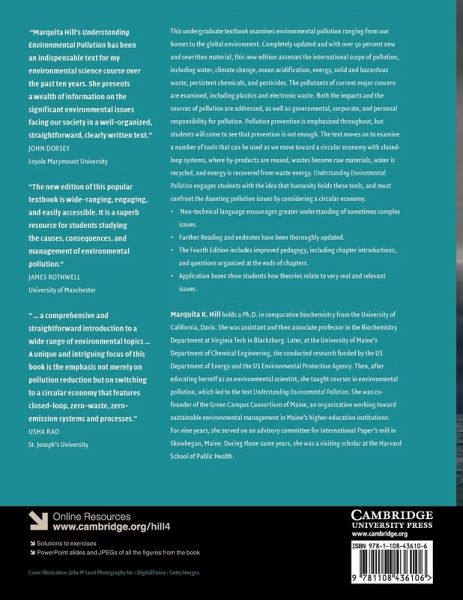 Marquita K. Hill holds a Ph.D. in comparative biochemistry from the University of California, Davis. She was assistant and then associate professor in the biochemistry department at Virginia Tech, Blacksburg. Later, at the University of Maine's Department of Chemical Engineering, she conducted research funded by the US Department of Energy and the US Environmental Protection Agency. Then, after educating herself as an environmental scientist, she taught courses in environmental pollution, which led to the text Understanding Environmental Pollution. She was co-founder of the Green Campus Consortium of Maine, an organization working toward sustainable environmental management in Maine's higher-education institutions. For nine years she served on an advisory committee for International Paper's mill in Skowhegan, Maine. During those same years she was a visiting scholar at the Harvard School of Public Health.