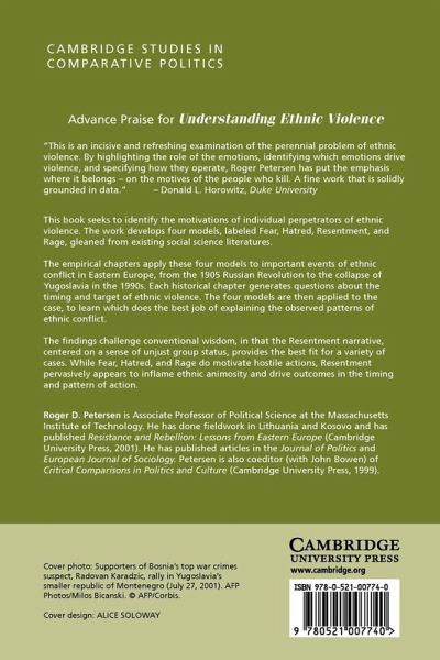 This 2002 book seeks to identify the motivations of perpetrators of ethnic violence. The work develops four models, labeled Fear, Hatred, Resentment, and Rage, gleaned from existing social science literatures. It then applies them to ethnic conflicts in Eastern Europe to learn which has the most explanatory value.