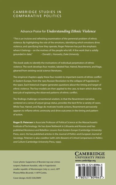 This 2002 book seeks to identify the motivations of individual perpetrators of ethnic violence. The work develops four models, labeled Fear, Hatred, Resentment, and Rage, gleaned from existing social science literatures. The empirical chapters apply these four models to important events of ethnic conflict in Eastern Europe, from the 1905 Russian Revolution to the collapse of Yugoslavia in the 1990s. Each historical chapter generates questions about the timing and target of ethnic violence. The four models are then applied to the case, to learn which does the best job in explaining the observed patterns of ethnic conflict. The findings challenge conventional wisdom, in that the Resentment narrative, centered on a sense of unjust group status, provides the best fit for a variety of cases. While Fear, Hatred, and Rage do motivate hostile actions, Resentment pervasively appears to inflame ethnic animosity and drive outcomes in the timing and pattern of action.