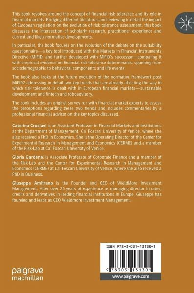 The book also looks at the future evolution of the normative framework post MiFID2 addressing in detail two key trends that are already affecting the way in which risk tolerance is dealt with in European financial markets - sustainable development and fintech and roboadvisory.