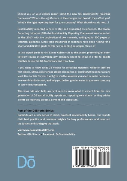 Should you or your clients report using the new G4 sustainability reporting framework? What's the significance of the changes and how do they affect you? What is the right reporting level for your company? What should you do next...?Sustainability reporting is here to stay and expanding its influence. The Global Reporting Initiative (GRI) G4 Sustainability Reporting Framework was launched in May 2013, with the publication of two manuals, adding up to 300 pages of technical guidance. Since then thousands of reporters have been hoping for a short and definitive guide to this new reporting paradigm. This is it!In this expert guide to G4, Elaine Cohen presents an easy-to-follow review of everything any company needs to know in order to decide whether to use the G4 Framework and if so, how. If you want to know what G4 means for corporate reporters, whether they are first-timers, SMEs, experienced global companies or existing GRI reporters at any level, this book is for you. It will give you the answers you need to make decisions, in a user-friendly format, and help you deliver greater value to your own company or your client companies.This book will also help users of reports know what to expect from the new generation of G4 Sustainability Reports and reporting consultants, as they advise clients on reporting process, content and disclosure.