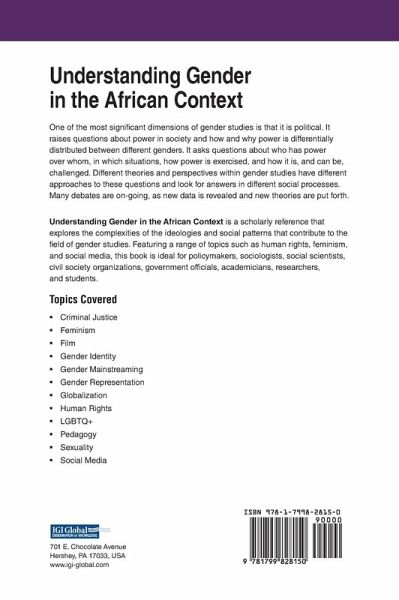 One of the most significant dimensions of gender studies is that it is political. It raises questions about power in society and how and why power is differentially distributed between different genders. It asks questions about who has power over whom, in which situations, how power is exercised, and how it is, and can be, challenged. Different theories and perspectives within gender studies have different approaches to these questions and look for answers in different social processes. Many debates are on-going, as new data is revealed and new theories are put forth. Understanding Gender in the African Context is a scholarly reference that explores the complexities of the ideologies and social patterns that contribute to the field of gender studies. Featuring a range of topics such as human rights, feminism, and social media, this book is ideal for policymakers, sociologists, social scientists, civil society organizations, government officials, academicians, researchers, and students.