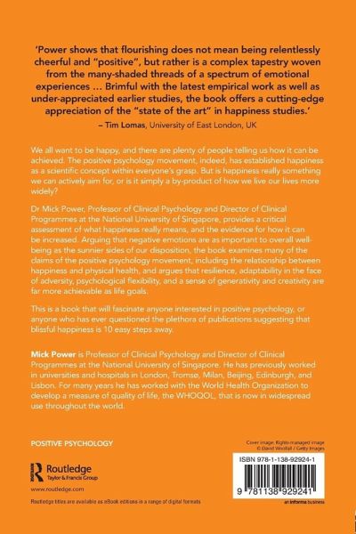 We all want to be happy, and there are plenty of people telling us how it can be achieved. The positive psychology movement, indeed, has established happiness as a scientific concept within everyone's grasp. But is happiness really something we can actively aim for, or is it simply a by-product of how we live our lives more widely? Dr. Mick Power, Professor of Clinical Psychology and Director of Clinical Programmes at the National University of Singapore, provides a critical assessment of what happiness really means, and the evidence for how it can be increased. Arguing that negative emotions are as important to overall well-being as the sunnier sides of our disposition, the book examines many of the claims of the positive psychology movement, including the relationship between happiness and physical health, and argues that resilience, adaptability in the face of adversity, psychological flexibility, and a sense of generativity and creativity are far more achievable as life goals. This is a book which will fascinate anyone interested in positive psychology, or anyone who has ever questioned the plethora of publications suggesting that blissful happiness is ten easy steps away.