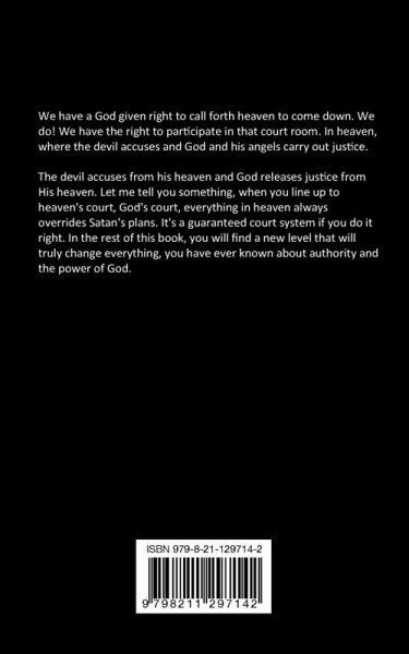 We have a God given right to call forth heaven to come down. We do! We have the right to participate in that court room. In heaven, where the devil accuses and God and his angels carry out justice. The devil accuses from his heaven and God releases justice from His heaven. Let me tell you something, when you line up to heaven's court, God's court, everything in heaven always overrides Satan's plans. It's a guaranteed court system if you do it right. In the rest of this book, you will find a new level that will truly change everything, you have ever known about authority and the power of God.
