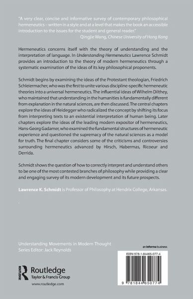 This series provides short, accessible and lively introduction to the major schools, movements and traditions in philosophy and the history of ideas since the beginning of the Enlightenment. All books in the series are written for undergraduates meeting the subject for the first time. Hermeneutics concerns itself with the theory of understanding and the interpretation of language. The question of how to correctly interpret and understand others remains one of the most contested branches of philosophy. In Understanding Hermeneutics Lawrence Schmidt provides an introduction to modern hermeneutics through a systematic examination of the ideas of its key philosophical proponents. Chapter 1 examines the ideas, of the Protestant theologian, Friedrich Schleiermacher, who argues that misunderstanding is always possible so we must always employ interpretation if we are to understnad correctly. Chapter 2 discusses the ideas of Dilthey, who maintains that understanding in the humanities is fundamentally different from explanation in the natural sciences, and who presents a methodology to judge what another person means or feels by means of their language and also their gestures, facial expressions, and manners of acting. Chapter 3 explores the ideas of Heidegger who radicalizes the concept by shifting its focus from interpreting texts to an existential interpretation of human being. In Chapter 4 the recent ideas of Gadamer are examined, which extend to examining the structures of hermeneutic experience and to question the supremacy of the natural sciences as models for truth. The final chapters consider some of the criticisms and controversies surrounding hermeneutics, including the work of Habermas, Hirsch, Ricoeur and Derrida, and the prospects for the future of hermeneutics.