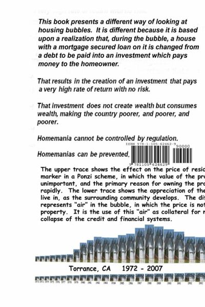 This housing bubble book doesn't talk about what happened to people during the Housing Bubble. It explains what a housing bubble is, why they occur, what ended them, that they can't be prevented or controlled by regulation, and how to prevent them in the future. It shows that housing bubbles are always a bad thing for the economy, and why. The book can do all of that when other books and TV programs about the bubble couldn't, because it is based upon the realization that a Homemania occurred in which houses were not bought because they provided shelter and comfort but because they were appreciating in price very rapidly. This caused a cessation of mortgage defaults. This lead to the creation of an investment that paid a very high return with zero apparent risk. The investment produced no wealth, but greatly increased comsumption, thereby impoverishing the economy. Explains mortgage backed securities including CDOs,CDSs, and Synthetic CDOs. Shows who was and wasn't culpable.