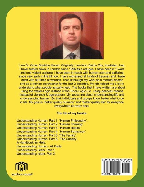 [I am Dr. Omar Sheikho Murad. Originally I am from Zakho City, Kurdistan, Iraq. I have settled down in London since 1996 as a refugee. I have been in 2 wars and one violent uprising. I have been in touch with human pain and suffering since very early in life till now. I have witnessed all kinds of traumas and I have dealt with all kinds of wounds. That is through my work as a medical doctor and as a trainee psychiatrist for the last 2 decades. My job helped me a lot to understand what people actually need. The books that I have written are about using the Water-Logic instaed of the Rock-Logic (i.e., using peaceful means instead of violence & aggression). My books are about understanding life and understanding human. So that individuals and groups know better what to do in life. My goal is "better quality humans" and "better quality life" for everyone everywhere at every time.] This is the list of my 7 books: Understanding Human, Part 1, "Human Philosophy". Understanding Human, Part 2, "Human Thinking". Understanding Human, Part 3, "Human Needs". Understanding Human, Part 4, "Human Behaviour". Understanding Human, Part 5, "The Family". Understanding Human, Part 6, "The Society". A Handbook for Help. Understanding Human - All Parts