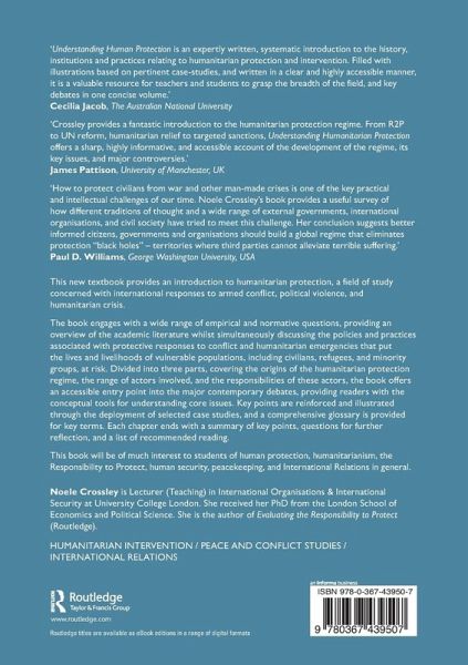 'Noele Crossley's Understanding Humanitarian Protection provides a comprehensive and thoughtful introduction to a range of themes related to conflict prevention, response, and management. The book is very well structured, as it moves through the history of humanitarian protection, then discusses key state and international actors in contemporary protection regimes, before systematically mapping different forms of intervention and crisis response. The analysis is neatly complemented by a wide range of case studies. The book would be an ideal addition to any undergraduate or post-graduate course on themes of peace and conflict.'--John Gledhill, University of Oxford, UK