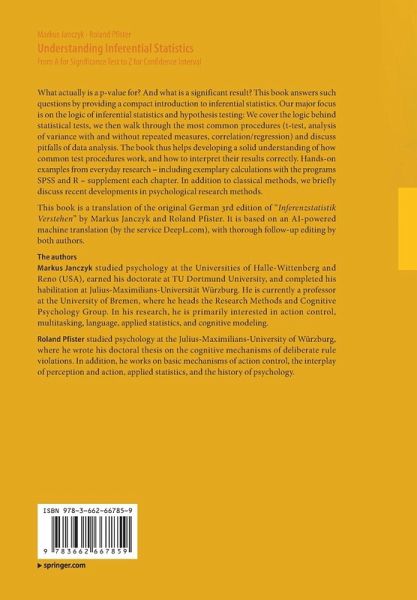 What actually is a p-value for? And what is a significant result? This book answers such questions by providing a compact introduction to inferential statistics. Our major focus is on the logic of inferential statistics and hypothesis testing: We cover the logic behind statistical tests, we then walk through the most common procedures (t-test, analysis of variance with and without repeated measures, correlation/regression) and discuss pitfalls of data analysis. The book thus helps developing a solid understanding of how common test procedures work, and how to interpret their results correctly. Hands-on examples from everyday research - including exemplary calculations with the programs SPSS and R - supplement each chapter. In addition to classical methods, we briefly discuss recent developments in psychological research methods.