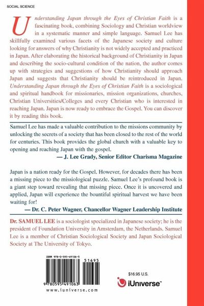Understanding Japan through the Eyes of Christian Faith. is a fascinating book, combining Sociology and Christian worldview in a systematic manner and simple language. Samuel Lee has skillfully examined various facets of the Japanese society and culture looking for answers of why Christianity is not widely accepted and practiced in Japan. After dealing the historical background of Christianity in Japan and describing the socio-cultural condition of the nation, the author comes up with strategies and suggestions of how Christianity should approach Japan and suggests that Christianity should be reintroduced in Japan. Understanding Japan through the Eyes of Christian Faith. is a sociological and spiritual handbook for missionaries, mission organizations, churches, Christian Universities/Colleges and every Christian who is interested in reaching Japan. Japan is now ready to embrace the Gospel. You can discover it by reading this book.