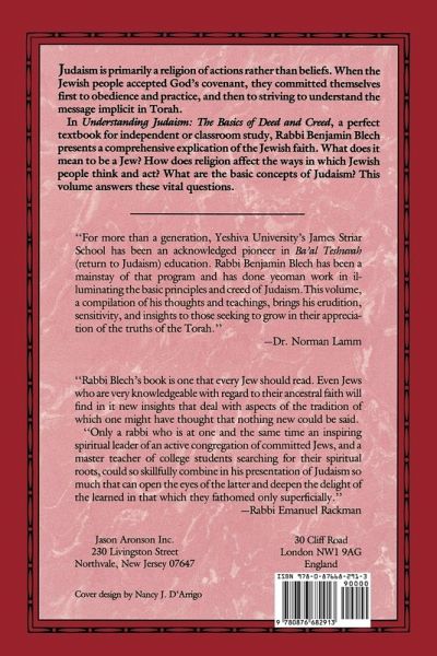 Judaism is primarily a religion of actions rather than beliefs. When the Jewish people accepted God's covenant, they committed themselves first to obedience and practice, and then to striving to understand the message implicit in the Torah. In Understanding Judaism: The Basics of Deed and Creed, a perfect textbook for independent and classroom study, Rabbi Benjamin Blech presents a comprehensive explication of the Jewish faith. What does it meant to be a Jew? How does religion affect the ways in which Jewish people think and act? What are the basic concepts of Judaism? This volume answers these vital questions.