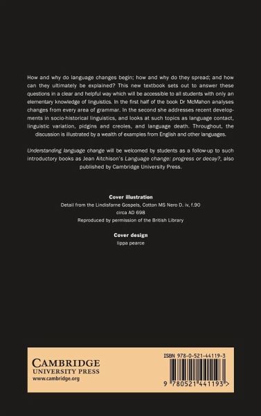 How and why do language changes begin; how and why do they spread; and how can they ultimately be explained? This new textbook sets out to answer these questions in a clear and helpful way which will be accessible to all students with an elementary knowledge of linguistics. In the first half of the book Dr McMahon analyses changes from every area of grammar. In the second she addresses recent developments in socio-historical linguistics, and looks at such topics as language contact, linguistic variation, pidgins and creoles, and language death. Throughout the discussion is illustrated by a wealth of examples from English and other languages. Understanding Language Change will be welcomed by students as a follow-up to such introductory books as Jean Aitchison's Language Change: Progress or Decay?, also published by Cambridge University Press.