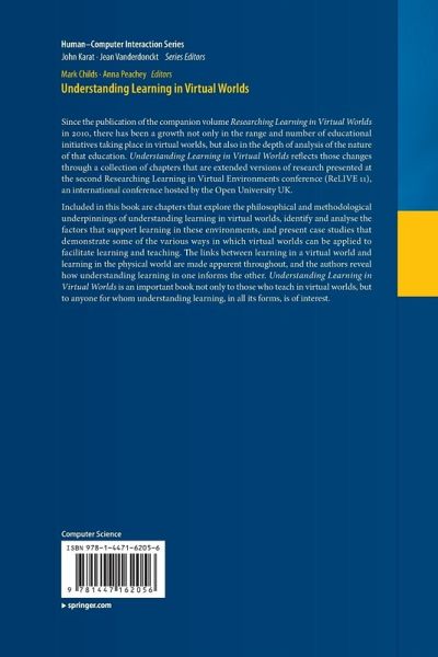 Included in this book are chapters that explore the philosophical and methodological underpinnings of understanding learning in virtual worlds, identify and analyse the factors that support learning in these environments, and present case studies that demonstrate some of the various ways in which virtual worlds can be applied to facilitate learning and teaching. The links between learning in a virtual world and learning in the physical world are made apparent throughout, and the authors reveal how understanding learning in one informs the other. Understanding Learning in Virtual Worlds is an important book not only to those who teach in virtual worlds, but to anyone for whom understanding learning, in all its forms, is of interest.
