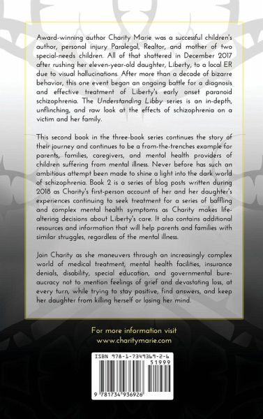 Award-winning author Charity Marie was a successful children's author, personal injury Paralegal, Realtor, and mother of two special-needs children. All of that shattered in December 2017 after rushing her eleven-year-old daughter, Liberty, to a local ER due to visual hallucinations. After more than a decade of bizarre behavior, this one event began an ongoing battle for a diagnosis and effective treatment of Liberty's early-onset paranoid schizophrenia. The Understanding Libby series is an in-depth, unflinching, and raw look at the effects of schizophrenia on a victim and her family. This second book in the three-book series continues the story of their journey and continues to be a from-the-trenches example for parents, families, caregivers, and mental health providers of children suffering from mental illness. Never before has such an ambitious attempt been made to shine a light into the dark world of schizophrenia. Book 2 is a series of blog posts written during 2018 as Charity's first-person account of her and her daughter's experiences continuing to seek treatment for a series of baffling and complex mental health symptoms as Charity makes life-altering decisions about Liberty's care. It also contains additional resources and information that will help parents and families with similar struggles, regardless of the mental illness. Join Charity as she maneuvers through an increasingly complex world of medical treatment, mental health facilities, insurance denials, disability, special education, and governmental bureaucracy not to mention feelings of grief and devastating loss, at every turn, while trying to stay positive, find answers, and keep her daughter from killing herself or losing her mind.