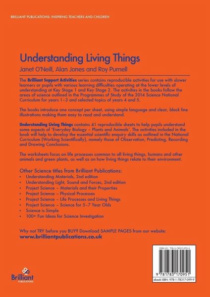 The Brilliant Support Activities series contains reproducible activities for use with slower learners or pupils with various learning difficulties operating at the lower levels of understanding at Key Stage 1 and Key Stage 2. The activities in the books follow the areas of science outlined in the Programmes of Study of the 2014 Science National Curriculum for years 1-3 and selected topics of years 4 and 5. The books introduce one concept per sheet, using simple language and clear, black line illustrations making them easy to read and understand. Understanding Living Things contains 41 reproducible sheets to help pupils understand some aspects of 'Everyday Biology - Plants and Animals'. The activities included in the book will help to develop the essential scientific enquiry skills as outlined in the National Curriculum (Working Scientifically), namely those of Observation, Predicting, Recording and Drawing Conclusions. The worksheets focus on life processes common to all living things, humans and other animals and green plants, as well as on how living things relate to their environment.