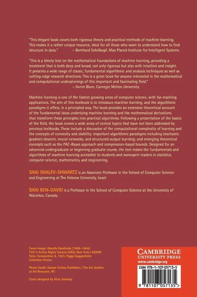 Machine learning is one of the fastest growing areas of computer science, with far-reaching applications. The aim of this textbook is to introduce machine learning, and the algorithmic paradigms it offers, in a principled way. The book provides a theoretical account of the fundamentals underlying machine learning and the mathematical derivations that transform these principles into practical algorithms. Following a presentation of the basics, the book covers a wide array of central topics unaddressed by previous textbooks. These include a discussion of the computational complexity of learning and the concepts of convexity and stability; important algorithmic paradigms including stochastic gradient descent, neural networks, and structured output learning; and emerging theoretical concepts such as the PAC-Bayes approach and compression-based bounds. Designed for advanced undergraduates or beginning graduates, the text makes the fundamentals and algorithms of machine learning accessible to students and non-expert readers in statistics, computer science, mathematics and engineering.