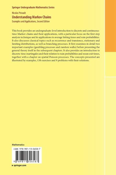 This book provides an undergraduate-level introduction to discrete and continuous-time Markov chains and their applications, with a particular focus on the first step analysis technique and its applications to average hitting times and ruin probabilities. It also discusses classical topics such as recurrence and transience, stationary and limiting distributions, as well as branching processes. It first examines in detail two important examples (gambling processes and random walks) before presenting the general theory itself in the subsequent chapters. It also provides an introduction to discrete-time martingales and their relation to ruin probabilities and mean exit times, together with a chapter on spatial Poisson processes. The concepts presented are illustrated by examples, 138 exercises and 9 problems with their solutions.