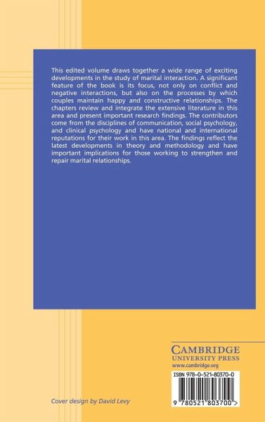 This edited volume draws together a wide range of exciting developments in the study of marital interaction. A significant feature of the book is its focus, not only on conflict and negative interactions but also on the processes by which couples maintain happy and constructive relationships. The chapters review and integrate the extensive literature in this area, as well as presenting important research findings. The contributors come from the disciplines of communication, social psychology and clinical psychology, and have national and international reputations for their work in this area. The findings reflect developments in theory and methodology, and have important implications for those working to strengthen and repair marital relationships.