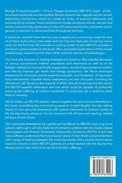 If you live with relentless exhaustion, post-exertional malaise (PEM), brain fog, or "normal" test results that explain nothing, this book will finally help you understand what's really going on. Millions with ME/CFS, Long Covid, and post-viral fatigue are told their symptoms are a mystery. But emerging research may at last reveal the underlying mechanisms - and offer a path toward meaningful improvement. In this clear, direct, and deeply hopeful guide, ME/CFS patient Patrick Ussher explains the breakthrough model proposed by Professors Klaus Wirth and Carmen Scheibenbogen. Their work brings together the major abnormalities seen in ME/CFS - low blood volume, microclots, autonomic dysfunction, mitochondrial impairment, autoimmunity, and more - into one interconnected cycle. It may finally explain why activity triggers PEM, why rest doesn't restore energy, and why so many develop chronic fatigue after a viral illness. This book goes far beyond theory. It offers practical tools, science-based insights, and real-world strategies that patients use to manage symptoms and improve quality of life. Inside, you'll learn about: Breathing techniques to improve oxygenation Ancestral nutrition and gut repair Microclot-oriented treatment approaches Blood-washing procedures (HELP Apheresis & Immunoadsorption) The Perrin Technique The strengths and limits of neuroplasticity ("brain retraining") Pacing, PEM management, and mitochondrial support The promising potential "Mitodicure" medication - the first drug candidate in development specifically for ME/CFS Patrick also shares his own ME/CFS journey with honesty and clarity: what has helped him, what has not, and how he learned to navigate a misunderstood illness with both realism and hope. If you live with: ME/CFS Long Covid post-viral fatigue dysautonomia / POTS unexplained fatigue with normal blood tests ...this book will give you a clear framework for understanding your symptoms and practical strategies that may help you feel better. Straightforward. Evidence-based. Patient-centred. A guide for anyone seeking answers to this - up until now - most 'mysterious' of illnesses. Includes a foreword by Prof. Klaus Wirth, co-developer of the Mitodicure therapy.