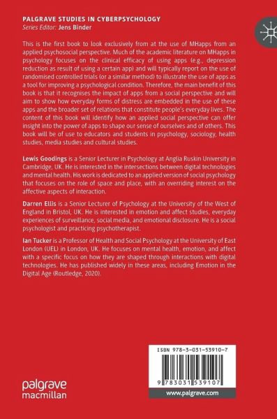 This is the first book to look exclusively from at the use of MHapps from an applied psychosocial perspective. Much of the academic literature on MHapps in psychology focuses on the clinical efficacy of using apps (e.g., depression reduction as result of using a certain app) and will typically report on the use of randomised controlled trials (or a similar method) to illustrate the use of apps as a tool for improving a psychological condition. Therefore, the main benefit of this book is that it recognises the impact of apps from a social perspective and will aim to show how everyday forms of distress are embedded in the use of these apps and the broader set of relations that constitute people's everyday lives. The content of this book will identify how an applied social perspective can offer insight into the power of apps to shape our sense of ourselves and of others. This book will be of use to educators and students in psychology, sociology, health studies, media studies andcultural studies.