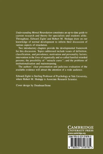 Understanding Mental Retardation constitutes an up-to-date guide to current research and theory for specialists and students alike. Throughout, Edward Zigler and Robert M. Hodapp draw on our knowledge of normal development to inform their discussion of various aspects of retardation. Two introductory chapters provide the developmental framework for this discussion. Topics addressed include issues of definition, classification, and prevalence; motivation and personality factors; intervention in the lives of organically and so-called familial retarded persons; the possibility of 'miracle cures'; and the problems of institutionalization and mainstreaming. The authors' clear presentation and judicious evaluation of the available evidence will attract the attention of a wide audience.