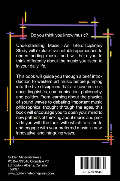 Do you think you know music? Understanding Music: An Interdisciplinary Study will explore five notable approaches to understanding music, and will help you to think differently about the music you listen to in your daily life. This book will guide you through a brief introduction to western art music before jumping into the five disciplines that are covered: science, linguistics, communication, philosophy, and politics. From learning about the physics of sound waves to debating important music philosophical thought through the ages, this book will encourage you to open your mind to new patterns of thinking about music and provide you with the tools with which to listen to and engage with your preferred music in new, innovative, and intriguing ways. copyright by Golden Meteorite Press, published by Golden Meteorite Press