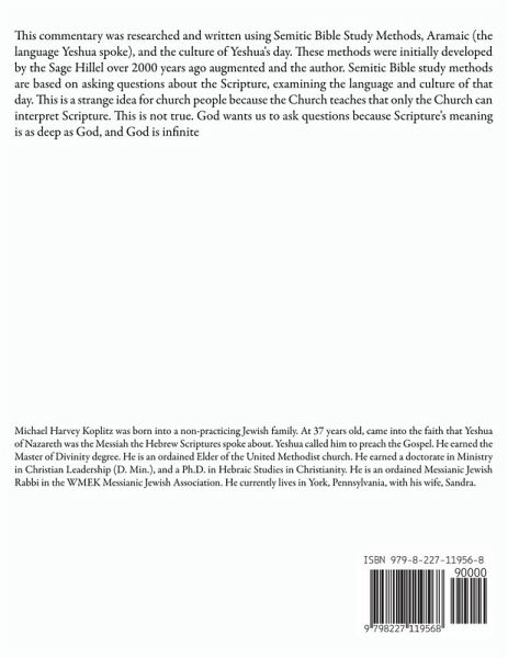 This commentary was researched and written using Semitic Bible Study Methods, Aramaic (the language Yeshua spoke), and the culture of Yeshua's day. These methods were initially developed by the Sage Hillel over 2000 years ago augmented and the author. Semitic Bible study methods are based on asking questions about the Scripture, examining the language and culture of that day. This is a strange idea for church people because the Church teaches that only the Church can interpret Scripture. This is not true. God wants us to ask questions because Scripture's meaning is as deep as God, and God is infinite