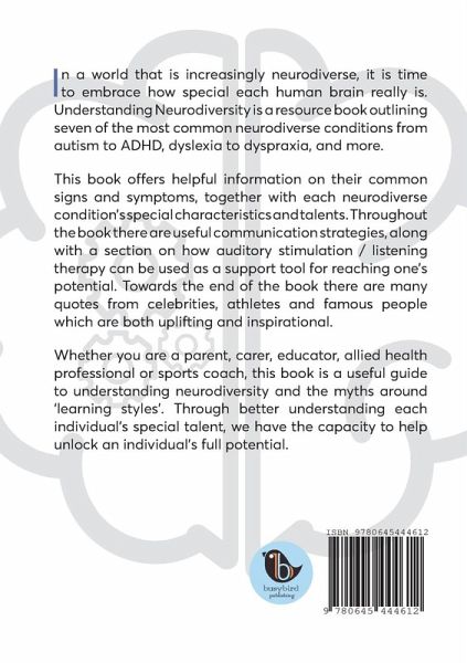 In a world that is increasingly neurodiverse, it is time to embrace how special each human brain really is. Understanding Neurodiversity is a resource book outlining seven of the most common neurodiverse conditions from autism to ADHD, dyslexia to dyspraxia, and more. This book offers helpful information on their common signs and symptoms, together with each neurodiverse condition's special characteristics and talents. Throughout the book there are useful communication strategies, along with a section on how auditory stimulation / listening therapy can be used as a support tool for reaching one's potential. Towards the end of the book there are many quotes from celebrities, athletes and famous people which are both uplifting and inspirational. Whether you are a parent, carer, educator, allied health professional or sports coach, this book is a useful guide to understanding neurodiversity and the myths around 'learning styles'. Through better understanding each individual's special talent, we have the capacity to help unlock an individual's full potential.