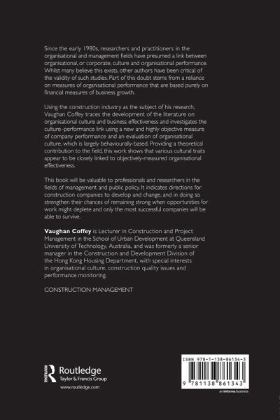 Since the early 1980s, researchers and practitioners in the organisational and management fields have presumed a link between organisational, or corporate, culture and organisational performance. Whilst many believe this exists, other authors have been critical of the validity of such studies. Part of this doubt stems from a reliance on measures of organisational performance that are based purely on financial measures of business growth. Using the construction industry as the subject of his research, Vaughan Coffey traces the development of the literature on organisational culture and business effectiveness and investigates the culture-performance link using a new and highly objective measure of company performance and an evaluation of organisational culture, which is largely behaviourally-based. Providing a theoretical contribution to the field, this work shows that various cultural traits appear to be closely linked to objectively measured organisational effectiveness. This book will be valuable to professionals and researchers in the fields of management and public policy. It indicates directions for construction companies to develop and change, and in doing so strengthen their chances of remaining strong when opportunities for work might deplete and only the most successful companies will be able to survive.