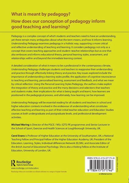"What is meant by pedagogy?How does our conception of pedagogy inform good teaching and learning?Pedagogy is a complex concept of which student and practising teachers need to have an understanding, yet there remain many ambiguities about what the term means, and how it informs learning in the classroom. Understanding Pedagogy examines pedagogy in a holistic way, supporting a more critical and reflective understanding of teaching and learning. It considers pedagogy as a concept that covers not just teaching approaches and pupil-teacher relationships but one which also embraces and informs educational theory, personal learning styles, assessment, and relationships inside and outside the classroom. A detailed consideration of what it means to be a professional in the contemporary climate, Understanding Pedagogy challenges student and practising teachers to reappraise their understanding and practice through effectively linking theory and practice. Key issues explored include the importance of understanding a learning styles profile, the application of cognitive neuroscience to teaching, personalised learning, assessment and feedback, and what we mean by critical reflection. Using the Personal Learning Styles Pedagogy, the authors make explicit the integration of theory and practice and the many decisions and selections that teachers make, their implications for what is being taught and learnt, how learners are positioned in the pedagogical process, and ultimately, how learning can be improved. Understanding Pedagogy will be essential reading for student and practising teachers, as well those on Education Studies courses and undertaking masters level courses, involved in the endeavour of understanding what constitutes effective teaching and learning"--