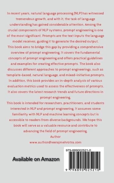 This book aims to bridge this gap by providing a comprehensive overview of prompt engineering. It covers the fundamental concepts of prompt engineering and offers practical guidelines and examples for creating effective prompts. The book also discusses different approaches to prompt engineerings, such as template-based, natural language, and mixed-initiative prompts. In addition, this book provides an in-depth analysis of various evaluation metrics used to assess the effectiveness of prompts. It also covers the latest research trends and future directions in prompt engineering. This book is intended for researchers, practitioners, and students interested in NLP and prompt engineering. It assumes some familiarity with NLP and machine learning concepts but is accessible to readers from diverse backgrounds. I hope this book will serve as a valuable resource and contribute to advancing the field of prompt engineering. Author