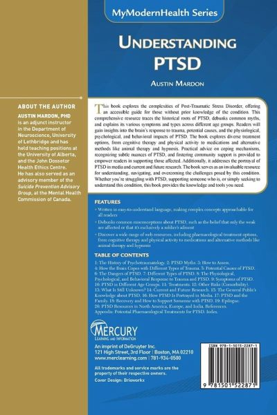 This book explores the complexities of Post-Traumatic Stress Disorder, offering an accessible guide for those without prior knowledge of the condition. This comprehensive resource traces the historical roots of PTSD, debunks common myths, and explains its various symptoms and types across different age groups. Readers will gain insights into the brain's response to trauma, potential causes, and the physiological, psychological, and behavioral impacts of PTSD. The book explores diverse treatment options, from cognitive therapy and physical activity to medications and alternative methods like animal therapy and hypnosis. Practical advice on coping mechanisms, recognizing subtle nuances of PTSD, and fostering community support is provided to empower readers in supporting those affected. Additionally, it addresses the portrayal of PTSD in media and current and future research. The book serves as an invaluable resource for understanding, navigating, and overcoming the challenges posedby this condition. Whether you're struggling with PTSD, supporting someone who is, or simply seeking to understand this condition, this book provides the knowledge and tools you need.