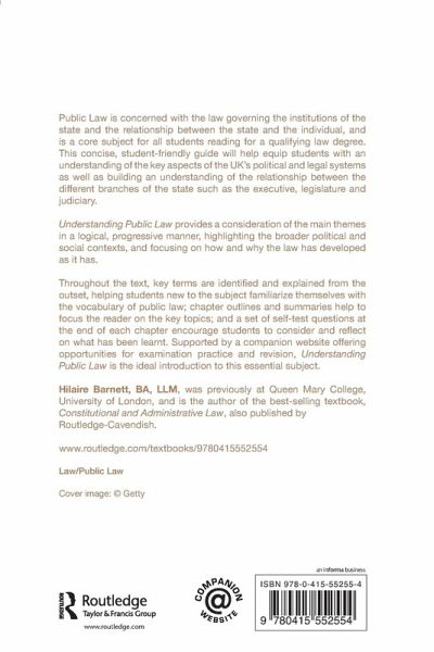 Public Law is concerned with the law governing the institutions of the state and the relationship between the state and the individual, and is a core subject for all students reading for a qualifying law degree. This concise, student-friendly guide will help equip students with an understanding of the key aspects of the UK's political and legal systems as well as building an understanding of the relationship between the different branches of the state such as the executive, legislature and judiciary. Understanding Public Law provides a consideration of the main themes in a logical, progressive manner, highlighting the broader political and social contexts, and focusing on how and why the law has developed as it has. Throughout the text, key terms are identified and explained from the outset, helping students new to the subject familiarize themselves with the vocabulary of public law; chapter outlines and summaries help to focus the reader on the key topics; and a set of self-test questions at the end of each chapter encourage students to consider and reflect on what has been learnt. Understanding Public Law is the ideal introduction to this essential subject.