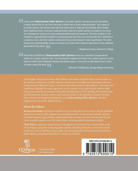 Click here to preview a sample chapter! In this highly anticipated revision, editors Barbara Norrander and Clyde Wilcox expose students to the substance and process of public opinion research in an accessible way. Capturing the diversity of this research with 12 essays—10 new to this edition and 2 fully updated—well-respected contributors highlight the many approaches social scientists use to explore public opinion while citing actual research and teasing out the political implications of their findings. Understanding Public Opinion expands on important ideas that basic textbooks cover only briefly, such as public views of those on trial for terrorist acts, public attitudes in the aftermath of Hurricane Katrina, and the rise and fall of public support for George W. Bush. Part introductions provide important thematic context, and a statistics primer in the appendix offers students a handy reference. More relevant and thought-provoking than ever, Understanding Public Opinion is the ideal supplement for any public opinion course.