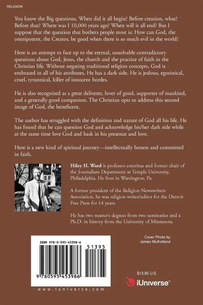 You know the Big questions. When did it all begin? Before creation, what? Before that? Where was I 10,000 years ago? When will it all end? But I suppose that the question that bothers people most is: How can God, the omnipotent, the Creator, be good when there is so much evil in the world? Here is an attempt to face up to the eternal, unsolvable contradictory questions about God, Jesus, the church and the practice of faith in the Christian life. Without negating traditional religion concepts, God is embraced in all of his attributes. He has a dark side. He is jealous, egotistical, cruel, tyrannical, killer of innocent hordes. He is also recognized as a great deliverer, lover of good, supporter of mankind, and a generally good companion. The Christian opts to address this second image of God,the beneficent. The author has struggled with the definition and nature of God all his life. He has found that he can question God and acknowledge his/her dark side while at the same time love God and bask in his presence and love. Here is a new kind of spiritual journey -- intellectually honest and committed in faith.