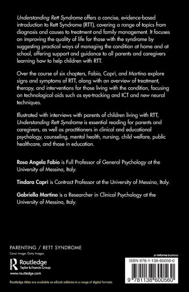 Understanding Rett Syndrome offers a concise, evidence-based introduction to Rett Syndrome (RTT), covering a range of topics from diagnosis and causes to treatment and family management. It focuses on improving the quality of life for those with the syndrome by suggesting practical ways of managing the condition at home and at school, offering support and guidance to all parents and caregivers learning how to help children with RTT.