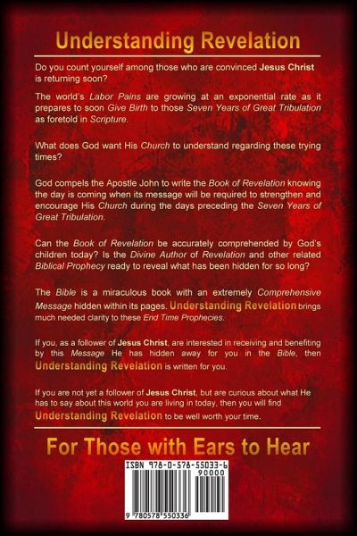 Do you count yourself among those who are convinced Jesus Christ is returning soon? The world's labor pains are growing at an exponential rate as it prepares to soon give birth to those Seven Years of Great Tribulation as foretold in scripture. What does God want His Church to understand regarding these trying times? God compels the Apostle John to write the Book of Revelation knowing the day is coming when its message will be required to strengthen and encourage His Church during the days preceding the Seven Years of Great Tribulation. Can the Book of Revelation be accurately comprehended by God's children today? Is the divine Author of Revelation and other related biblical prophecy ready to reveal what has been hidden for so long? The Bible is a miraculous book with an extremely comprehensive message hidden within its pages. Understanding Revelation brings much needed clarity to these End Time prophecies. If you, as a follower of Jesus Christ, are interested in receiving and benefiting by this message He has hidden away for you in the Bible, then Understanding Revelation is written for you. If you are not yet a follower of Jesus Christ, but are curious about what He has to say about this world you are living in today, then you will find Understanding Revelation to be well worth your time.