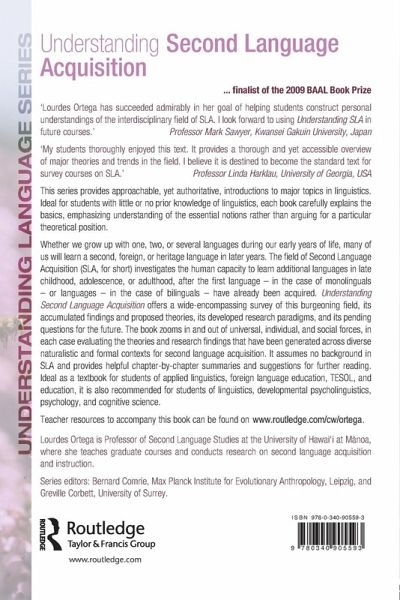 Lourdes Ortega has succeeded admirably in her goal of helping students construct personal understandings of the interdisciplinary field of SLA. She is thorough in presenting the most up-to-date research bearing on the important controversies in SLA and does so with an engaging, personable, reader-friendly style that invites students to stay focused on the broader meanings of the research findings.