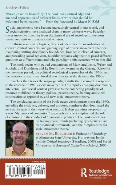 In thirteen succinct chapters, Buechler traces movement theories from the classical era of sociology to the most recent examples of transnational activism. He identifies the socio-historical context, central concepts, and guiding logic of diverse movement theories, with emphasis on: Comparisons of Marx and Lenin; Weber and Michels; and Durkheim and LeBon The Chicago School of the inter-war period The political-sociological approaches of the 1950s The varieties of strain and breakdown theories at the dawn of the 1960s Major paradigm shifts caused by the cascade of 1960s social movements Critiques, debates, and proposed syntheses dominating the turn of the 21st century Recent trends (such as cyberactivism and transnational movements) and their theoretical implications