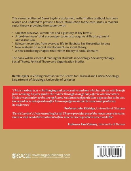 "This is a robust text - challenging and provocative and one which students will benefit from reading. Layder guides the reader through a large body of relevant literature. He draws attention to the strengths and weaknesses of particular approaches as he sees them and he is not afraid to offer his own judgements on the issues and problems he addresses." - Professor John Eldridge, University of Glasgow "One of the most comprehensive, incisive and readable treatments of the macro-micro problem now available." - Professor Paul Colomy, University of Denver This is a revised, updated and enlarged version of the accessible, authoritative first edition - a jargon-free textbook that provides an introduction to the core issues in social theory. It includes: * Chapter previews, summaries and a glossary of key terms. * A 'problem focus' that encourages students to acquire skills of argument and discussion. * A concluding chapter relating theory to social domains. * Relevant examples from everyday life to illustrate key theoretical issues. It is essential reading for undergraduate and postgraduate students of social and sociological theory.