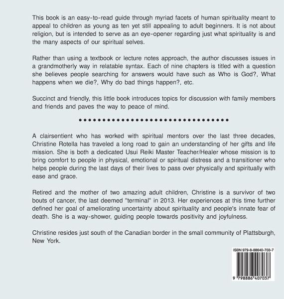 This book is an easy-to-read guide through the myriad facets of human spirituality meant to appeal to children as young as ten yet still appealing to adult beginners. It is NOT about religion but is intended to serve as an eye-opener regarding just what spirituality is and the many aspects of our spiritual selves. Rather than using a textbook approach, the author discusses issues in a grandmotherly way in relatable syntax. Each of nine chapters is titled with a question she believes people searching for answers would have such as "Who/what is God?", "What happens when we die?", Why do bad things happen?", etc. Succinct and friendly, this little book introduces topics for discussion with family members and friends, and paves the way to peace of mind.