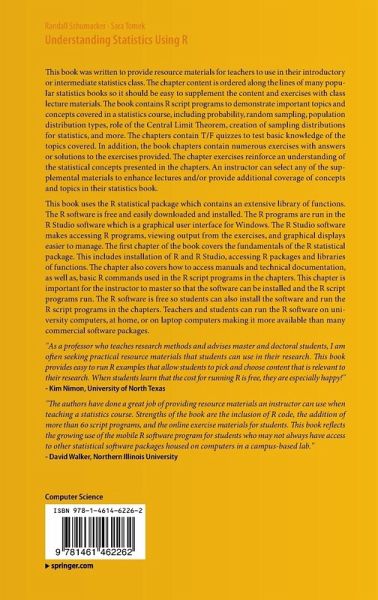 The book contains R script programs to demonstrate important topics and concepts covered in a statistics course, including probability, random sampling, population distribution types, role of the Central Limit Theorem, creation of sampling distributions for statistics, and more. The chapters contain T/F quizzes to test basic knowledge of the topics covered. In addition, the book chapters contain numerous exercises with answers or solutions to the exercises provided. The chapter exercises reinforce an understanding of the statistical concepts presented in the chapters. An instructor can select any of the supplemental materials to enhance lectures and/or provide additional coverage of concepts and topics in their statistics book.
