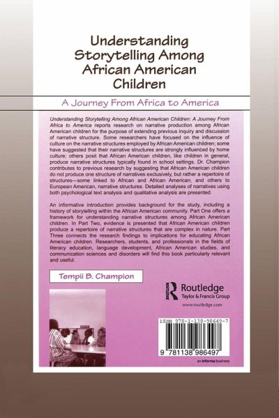 Understanding Storytelling Among African American Children: A Journey From Africa to America reports research on narrative production among African American children for the purpose of extending previous inquiry and discussion of narrative structure. Some researchers have focused on the influence of culture on the narrative structures employed by African American children; some have suggested that their narrative structures are strongly influenced by home culture; others posit that African American children, like children in general, produce narrative structures typically found in school settings. Dr. Champion contributes to previous research by suggesting that African American children do not produce one structure of narratives exclusively, but rather a repertoire of structures, some linked to African and African American, and others to European American narrative structures. Detailed analyses of narratives using both psychological text analysis and qualitative analysis are presented. An informative introduction provides background for the study, including a history of storytelling within the African American community. Part I offers a framework for understanding narrative structures among African American children. In Part II, evidence is presented that African American children produce a repertoire of narrative structures that are complex in nature. Part III connects the research findings to implications for educating African American children. Researchers, students, and professionals in the fields of literacy education, language development, African American studies, and communication sciences and disorders will find this book particularly relevant and useful.