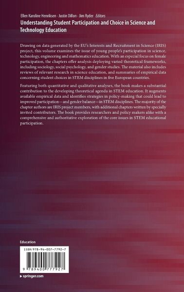 Introduction: Participation in science and technology education - presenting the challenge and introducing project IRIS.- Section 1:Theoretical perspectives on educational choice.- Chapter 1: Expectancy-value perspectives on STEM choice in late-modern societies.- Chapter 2. A narrative approach to understand students' identities and choices.- Chapter 3: Gender, STEM studies and educational choices. Insights from feminist perspectives.- Section 2: Interest and participation in STEM from primary school to phD.- Chapter 4: STEM attitudes, interests and career choice.- Chapter 5: Science aspirations and gender identity: Lessons from the ASPIRES project.- Chapter 6: The impact of science curriculum content on students' subject choices in post-compulsory schooling.- Chapter 7: A place for STEM: Probing the reasons for undergraduate course choices.- Chapter 8: Short stories of educational choice - in the words of science and technology students.- Chapter 9: Understanding declining science participation in Australia: A systemic perspective.- Chapter 10: Choice patterns of PhD students: why should i pursue a PhD?.- Chapter 11: The impact of outreach and out-of-school activities on Norwegian upper secondary students' STEM motivations.- Section 3: Staying in STEM, leaving STEM?.- Chapter 12: Why do students in stem higher education programmes drop/opt out? Explanations offered from research.- Chapter 13: What makes them leave and where do they go? Non-completion and institutional departures in STEM.- Chapter 14: The first-year experience: Students' encounter with science and engineering programmes.- Chapter 15: Keeping pace. Educational choice motivations and first-year experiences in the words of Italian students.- Section 4: Applying feminist perspectives to understand STEM participation.- Chapter 16: When research challenges gender stereotypes: Exploring narratives of girls' educational choices.- Chapter 17: Italian femaleand male students' choices: STEM studies and motivations.- Chapter 18: Being a woman in a man's place or being a man in a women's place: insights into students' experiences of science and engineering at university.- Chapter 19: Italian students' ideas about gender and science in late modern societies. interpretations from a feminist perspective.- Section 5: Understanding and improving STEM participation: Conclusions and recommendations.- Chapter 20: Understanding student participation and choice in science and technology education: The contribution of IRIS.- Chapter 21: Improving participation in science and technology higher education: Ways forward.- Appendix: The IRIS questionnaire: Brief account of instrument development, data collection and respondents.